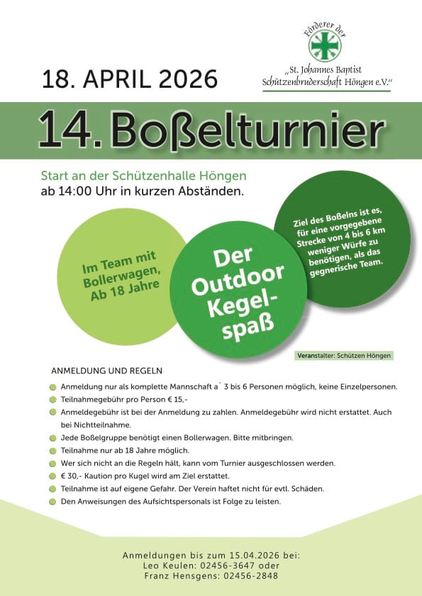 14. Boßelturnier Uwe Huchel | vor 4 Tagen | 1 Min. Lesezeit 14. Boßelturnier U Uwe Huchel | vor 4 Tagen | 1 Min. Lesezeit Am Samstag den 18.04. findet das 14. Boßelturnier in Höngen statt. Anmeldung bis 15.4. bei Leo Keulen 02456 3647 oder Franz Hensgens 02456 2848 Teilen:
