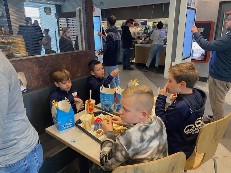 Vor dem Stadionbesuch gab es beim „goldenen M“ noch eine Stärkung. Für die zwei Geburtstagskinder der Woche Marlon und Mats wurde auf dem Parkplatz ein Ständchen gesungen.