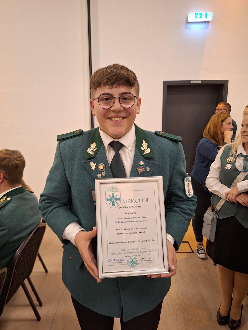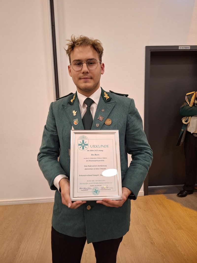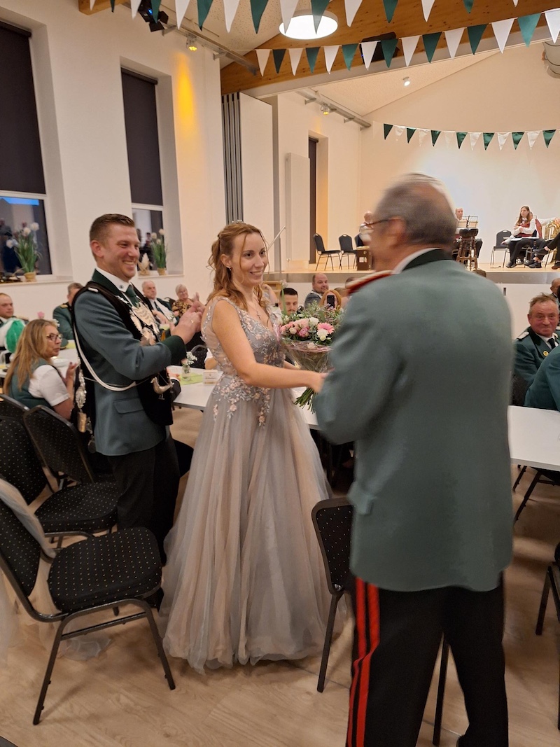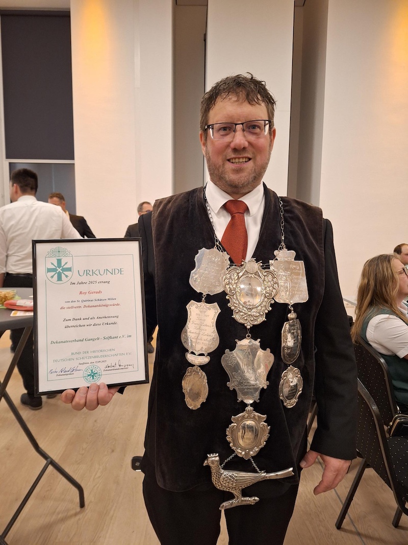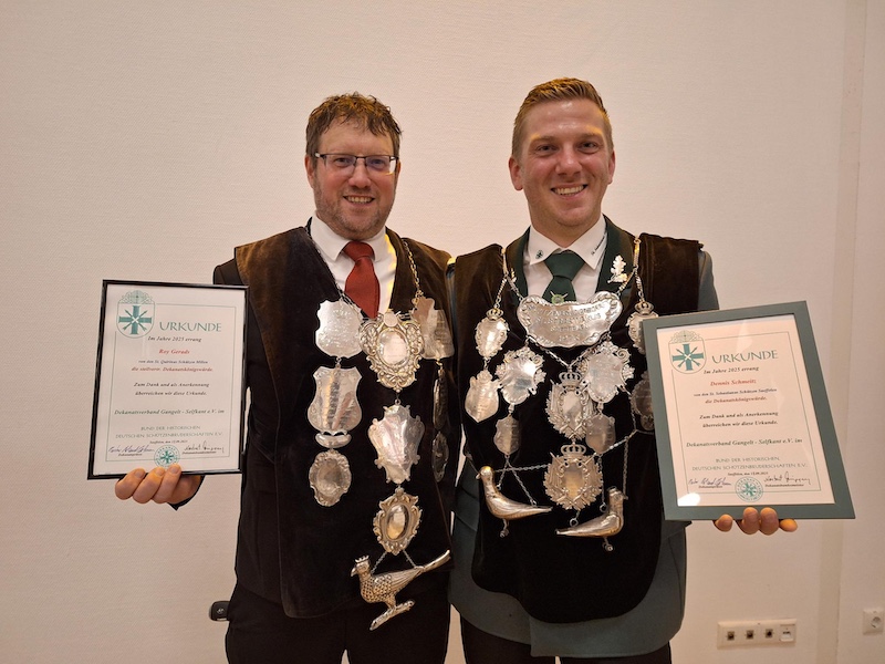 Der neue Dekanatskönig Dennis Schmeitz wurde für seine herausragende Leistung geehrt. Gemeinsam mit seiner Frau Vera Schmeitz, die nun als Dekanatskönigin fungiert, wird er die Bruderschaft und das Dekanat repräsentieren. Präsident Schmeitz betonte: „Du trägst die Dekanatskönigswürde mit Stolz, mit Haltung – und mit einem Lächeln – das zeigt: Du bist genau der Richtige für dieses Amt.“