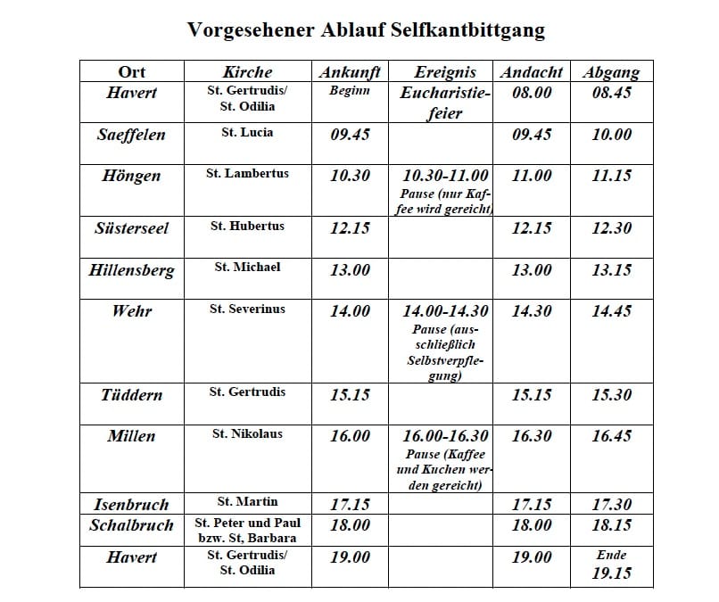 Am Sonntag, dem 22. März 2026, wollen wir wieder den schönen Selfkant gemeinsam mit Gebet, Gesang, Stille halten und persönlicher Begegnung mit Gott und untereinander durch-wandern. Wir beginnen mit der gemeinsamen Eucharistiefeier um 08.00 Uhr in St. Gertrud, Havert und ziehen von dort aus zu den Kirchen/Kapellen der jeweiligen Dörfer im Selfkant.