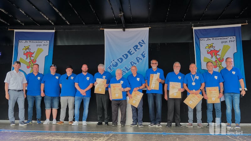 Ein angenehmer Auftritt für Bürgermeister Norbert Reyans. Er konnte Willi Hamacher, Heinz Portz, Helmut Hörter, Alfons Schürmann, Wilfried Meesen, Peter Honings, Peter Spirtz und Jos Palmen (nicht auf dem Bild) die Urkunden für Ehrenmitgliedschaft der Witsemänn überreichen.