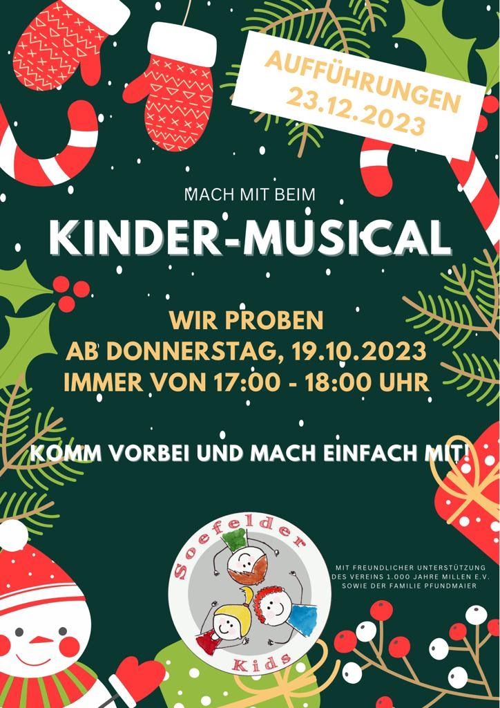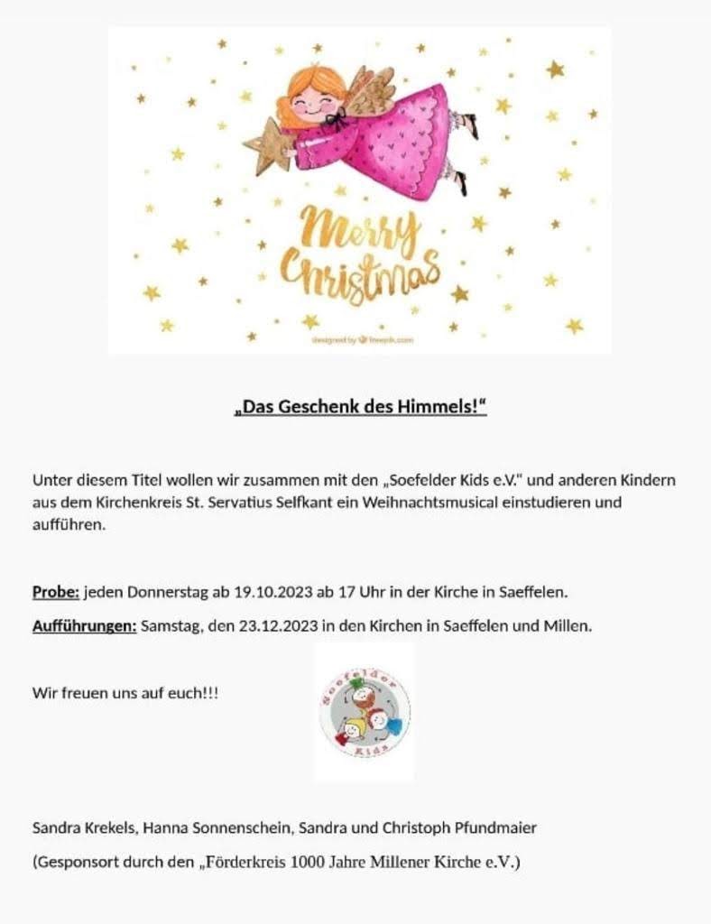 Am Samstag, dem 23.12. 2023 findet in Millen und in Saeffelen, jeweils eine Aufführung des Kinder-Weihnachtsmusicals: " Das Geschenk des Himmels" statt.