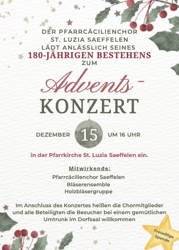 Dieses Jubiläum nimmt der Chor zum Anlass die Dorfbevölkerung, befreundete Vereine und Anhänger der Musik und des Gesanges zu einem Adventskonzert am 15. Dezember um 16.00 Uhr in der Pfarrkirche St. Luzia Saeffelen einzuladen.