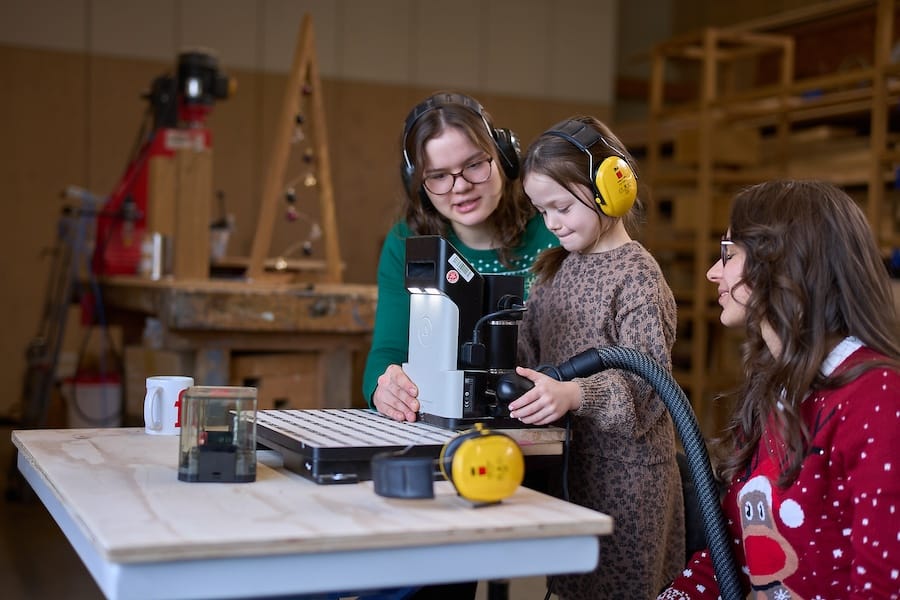 Die vorbereiteten Eiche-Brettchen konnten mit einer modernen Shaper Origin, einer digitalen Oberfräse, individuell graviert werden. Namen, weihnachtliche Motive oder kleine Botschaften verzierten die Brettchen. Und natürlich war die Bewirtung bestens.