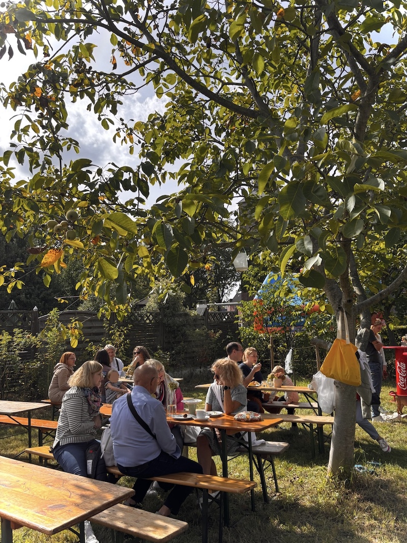 Durch gelungene Zusammenarbeit wurde der Dorfgarten kurzerhand in eine Location verwandelt, in der man gemütlich Kaffee trinken und Kuchen essen sowie in vielen Gesprächen das fantastische Wetter genießen konnte. Auch die Kleinen kamen nicht zu kurz: die Kinder konnten sich auf dem benachbarten Spielplatz oder auf der für sie angeschafften Hüpfburg austoben.