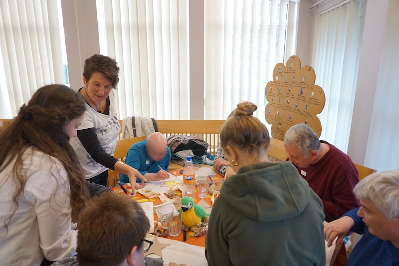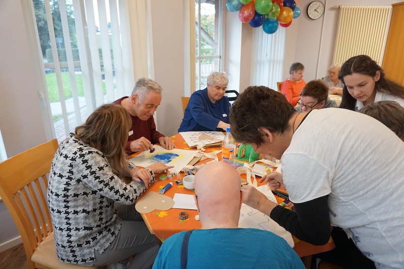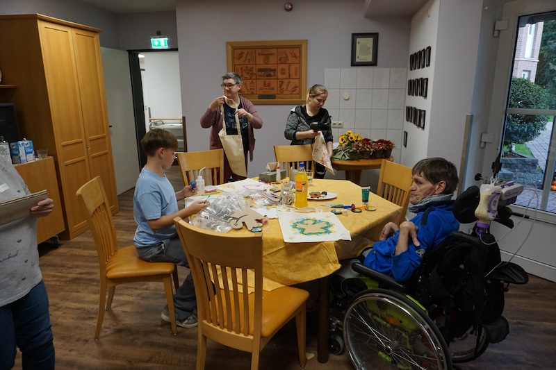 Ein reges Treiben herrschte am Samstagnachmittag in der Wohnstätte Höngen. Gemeindereferentin Gabriele Thönnessen hatte zu einem Bastelworkshop eingeladen. Stofftaschen sollten künstlerisch gestaltet werden. Damit möglichst viele Bewohnerinnen und Bewohner teilnehmen konnten, gab es Unterstützung: 2 Ehrenamtler waren gekommen und, besonders erfreulich, 2 Frauen aus dem Pfarrverbund mit ihren Kindern halfen ebenfalls.