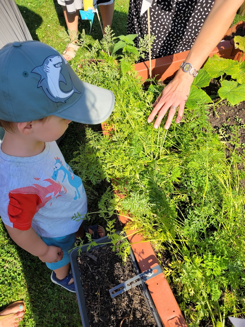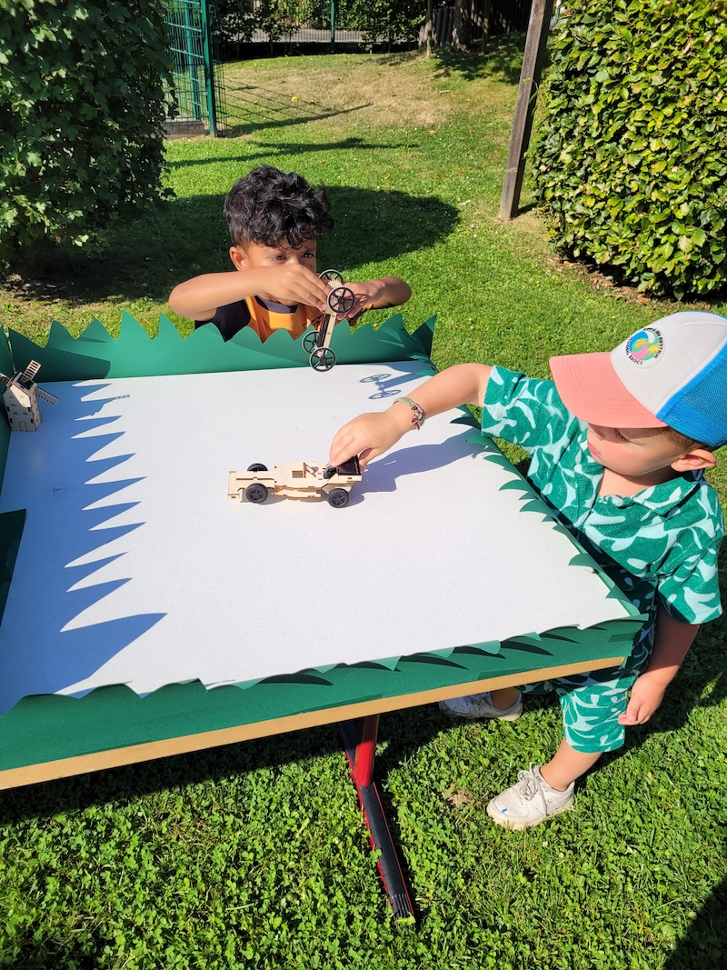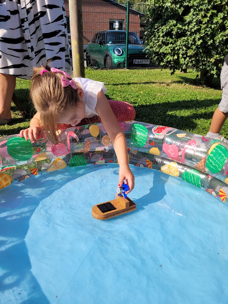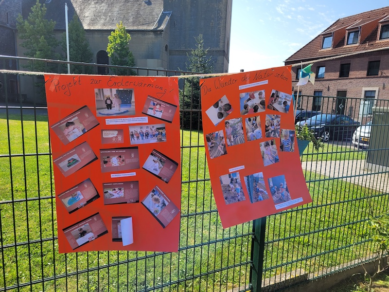 Im Anschluss an die Feier, luden die Kinder ihre Gäste ein, sowohl ihre Ausstellung zu besuchen, als auch kleine Häppchen aus selbstgeerntetem Obst und Gemüse sowie den Saft der erst am Vortag geernteten Kindergartentrauben zu probieren. In der Ausstellung präsentierten die Kinder die Projekte der letzten Monate. Neben kleinen solarbetriebenen Autos und Booten gab es Windräder, zahlreiche upcycelte Gegenstände, Kinderbücher zum Thema und eine umfassende Fotostrecke.