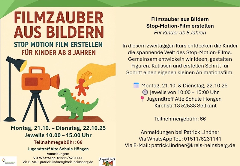 Technisch und kreativ wird es am Montag, 20. Oktober, und am Dienstag, 21. Oktober 2025. Jeweils von 10 bis 15 Uhr findet ein Stop-Motion-Kurs für Kinder ab 8 Jahren statt. Mit viel Fantasie entstehen kleine Filme aus Einzelbildern. Die Kosten belaufen sich auf 6 Euro pro Kind.