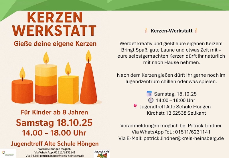 Am Samstag, 18. Oktober 2025, heißt es: kreativ werden! Beim Kreativ- und Chilltreff für Kinder ab 8 Jahren steht die Kerzenwerkstatt auf dem Programm. Von 14 bis 18 Uhr können die Teilnehmerinnen und Teilnehmer ihre eigenen Kerzen gießen. Natürlich dürfen Kinder und Jugendliche auch einfach zum Chillen und Spielen vorbeikommen, ohne an der Aktion teilzunehmen.