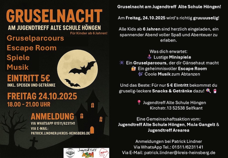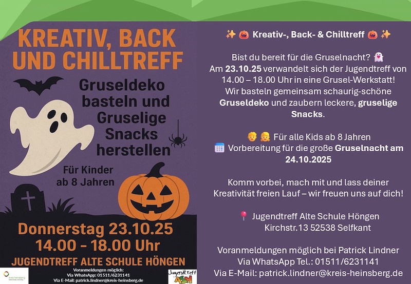 Am Donnerstag, 23. Oktober 2025, lädt der Jugendtreff von 14 bis 18 Uhr zum Kreativ-, Back- und Chilltreff ein. Unter dem Motto „Gruselnacht vorbereiten“ werden gemeinsam schaurige Snacks und Dekorationen hergestellt. Auch hier gilt: Wer nicht mitbasteln möchte, kann gerne zum Chillen und Spielen vorbeischauen.