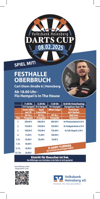Anmeldungen und Informationen sind ab sofort unter https://www.volksbank-heinsberg.de/vobahs-dartscup möglich bzw. abrufbar.