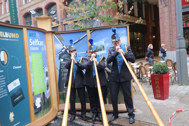 In diesem Jahr feierte der Zipfelbund seine 24. Teilnahme am Deutschlandfest zum Tag der Deutschen Einheit. In Hamburg gab es erneut eine tolle Präsentation. Bürgermeister Norbert Reyans und sein Team mit Sara Conen, Lisa Backhaus und Judith Killen machten allerbeste Werbung für den Selfkant. Besonders der Spielmannszug Edelweiß Havert mit seinem Spiel und ganz besonders mit der Showparade sowie auch die Gruppe Rabbatz brachten die Landermeile in Wallung. Vor dem Stand des Zipfelbundes gab es bei den Musikspielen "Stau" ohne Ende. Und es folgten "Zugabe, Zugabe, Zugabe" Rufe für den Spielmannszug. Karl Fijen und seine Musiker entfachten den echten Hamburger Sturmwirbel auf der Ländermeile.