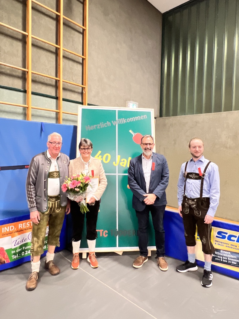 Nach der Begrüßung durch den Geschäftsführer Markus Brandts wurde durch den Ortsvorsteher Heinz-Hubert Ruers der aktuellen Vorsitzenden Ruth Mulder die Bronze Ehrennadel für besondere Verdienste im Tischtennis Sport in Vertretung für den Westdeutschen Tischtennis Verband e.V. verliehen. Ruth Mulder ist seit 1986 im TTC Tüddern aktiv und kümmert sich um alle Belange des Tischtennis Sport und ist überregional bekannt. Sie begleitet und trainiert die Jugendmannschaften und versucht immer alle Mitglieder zu fördern und zu motivieren.