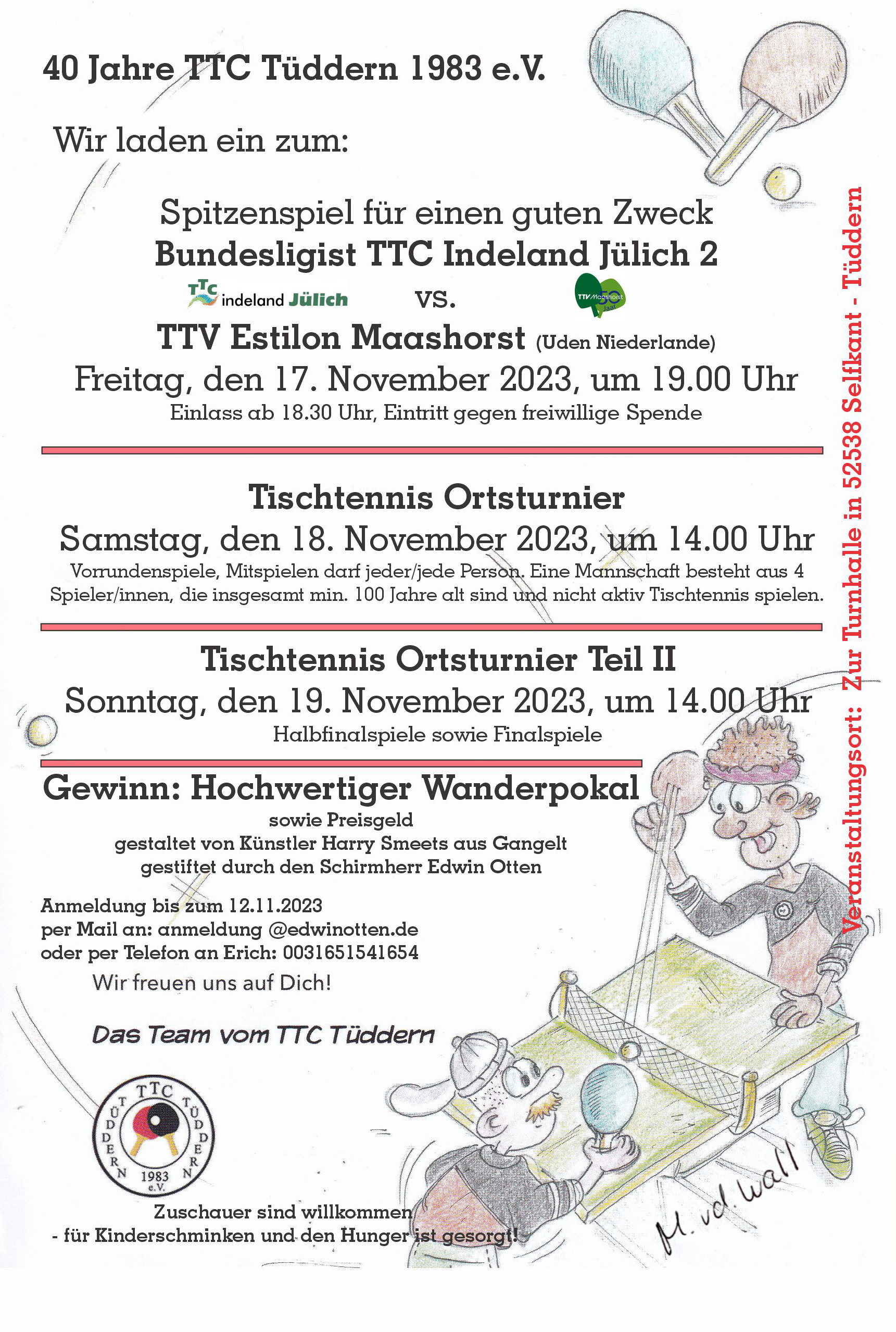 Ab Samstag findet ein Tischtennisturnier für jedermann statt. Eine Mannschaft muss addiert 100 Jahre alt sein. Anmeldung werden unter anmeldung@edwinotten.de oder Tel: 0031651541654 angenommen. Wer also mal den Tischtennissport ausprobieren mag in einem Turnier gerne anmelden.