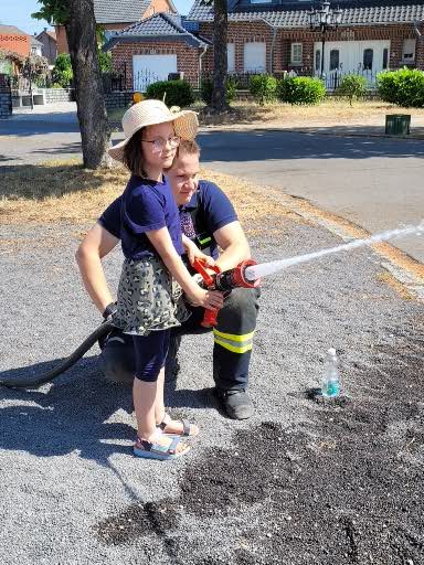 Kraft und Zielsicherheit bewiesen die Kinder beim Halten des Feuerwehrschlauches. Auch das Betreuungspersonal war bei diesem Angebot in Aktion, denn es wurden sowohl die Einsatzbereiche als auch die Handhabung eines Feuerlöschers erklärt und ausprobiert.