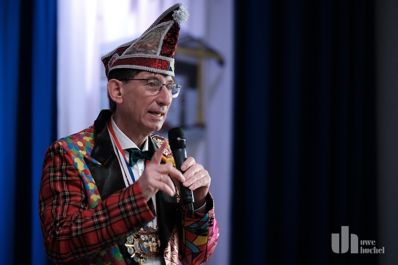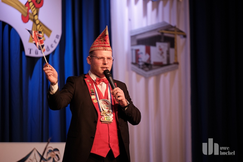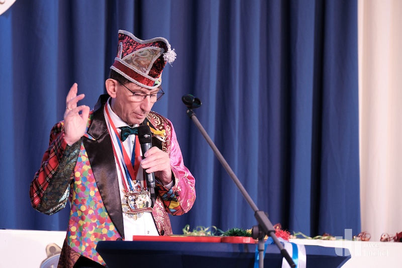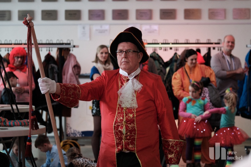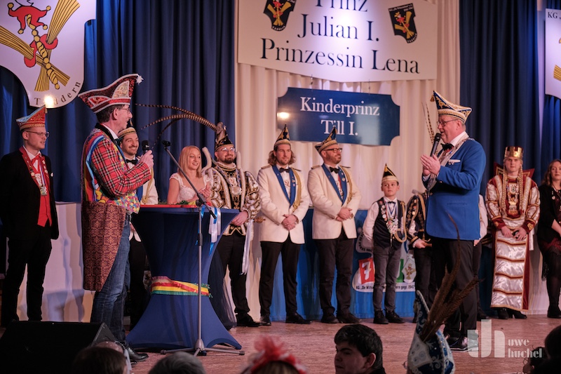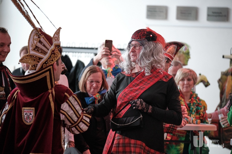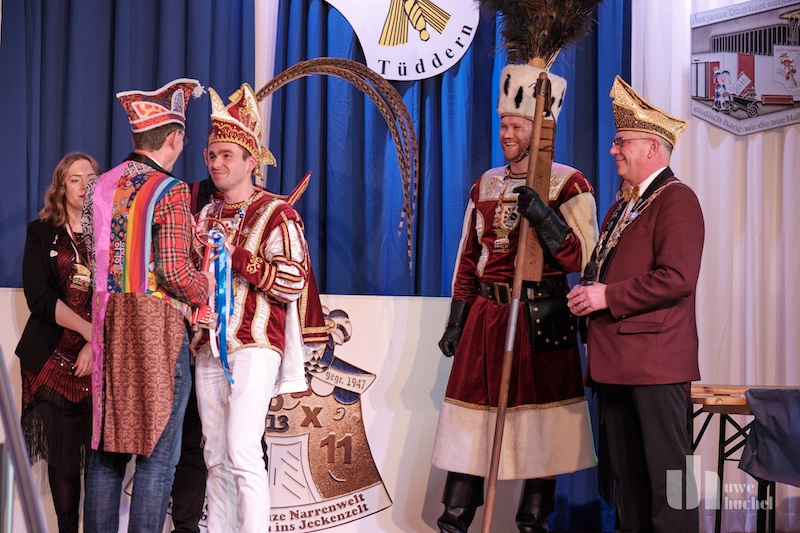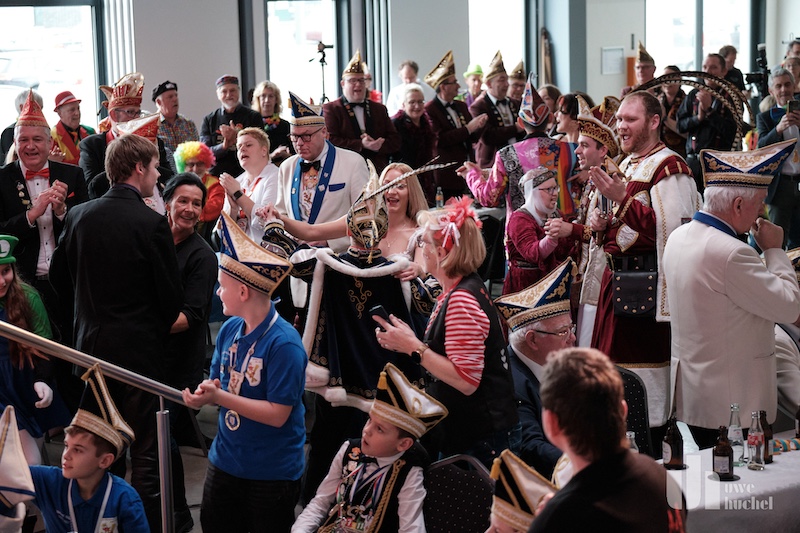Die Schlüsselübergabe des Bürgermeisters fand heute in Tüddern statt. Zu einem Rathaussturm kam es schon deshalb nicht, da als Veranstaltungsort die Westzipfelhalle gewählt wurde. Nach einer kurzen Begrüßung durch Norbert Reyans begann das bunte Treiben mit einer Tanzdarbietung. In seiner närrischen Ansprache lobte der Bürgermeister den Selfkant in all seinen Facetten und beendete seine Rede mit dem medialen Dauerthema der letzen Woche. Der Sitzungpräsident der Tüdderner Witsemänn erinnerte dann an den eigentlichen Anlass des Karnevals, ehe die Rathausschlüssel in Windeseile und völlig ohne Widerstand an die Majestäten und Repräsentanten aus Höngen, Süsterseel und Tüddern übergeben wurden. Heinz Eschweiler hatte Mühe das obligatorische Pressefoto zu bekommen.