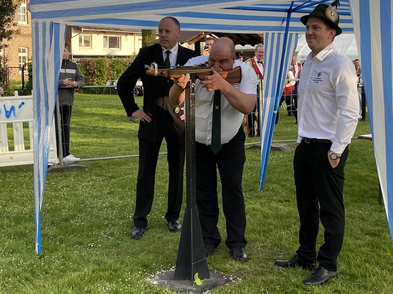 Bei bestem Wetter und zahlreichen Gästen wurde im Vorprogramm des Königsvogelschusses nach langer Pause der Bürgervogel ausgeschossen. Eine lange Schlange stand am Schießstand um den begehrten Preis zu erreichen und die erreichten Zwischengewinne in Getränke umzuwandeln. Am Ende setze sich Phillip Schmitz durch und schoss den letzten Block des Korpus des Bürgervogels ab.