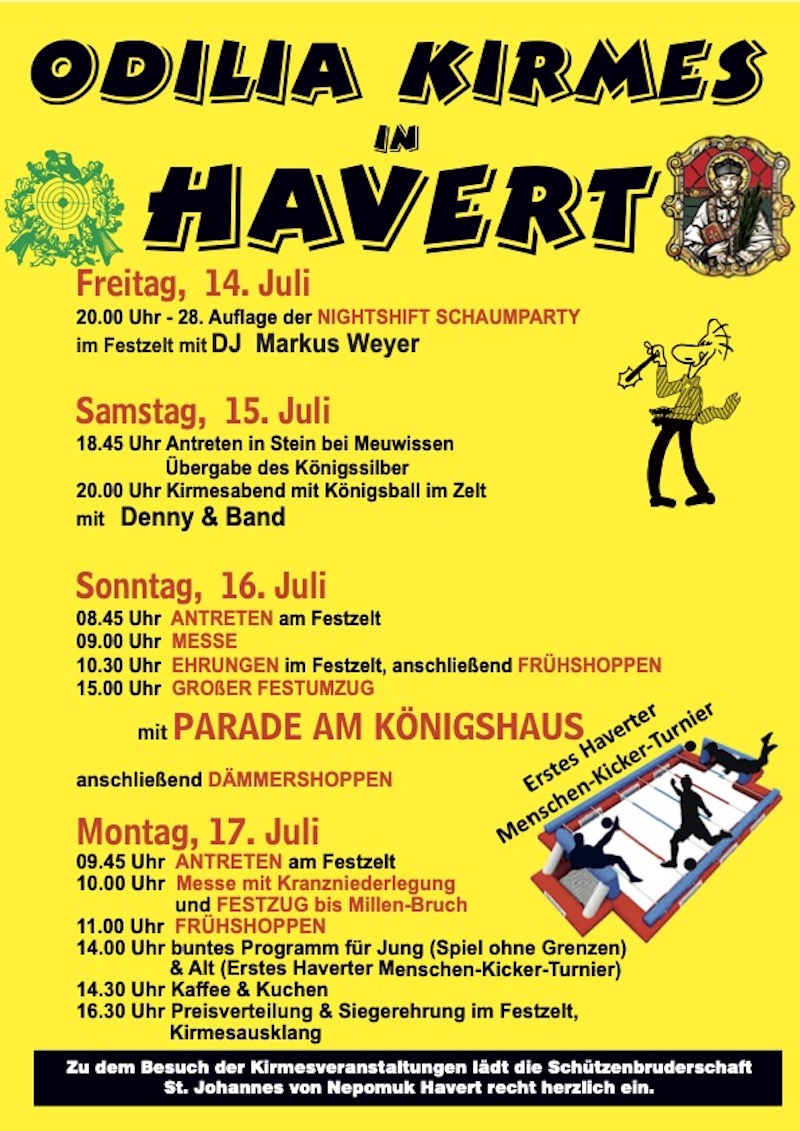 Da ist für jeden etwas dabei. Von Freitag, 14. Juli bis Montag, 17. Juli heißt es in Havert wieder „Kirmes in het Dörp“. Gut zwei Monate nach dem erfolgreichen Dekanatsschützenfest, lässt es sich die Schützenbruderschaft Havert nicht nehmen, die Bevölkerung zum nächsten großen Fest einzuladen. Der neue Schützenvorstand hat sich ein buntes Programm aus Festumzügen, Tanzveranstaltungen, Paraden und sportlichem Wettbewerb für Jung und Alt überlegt.