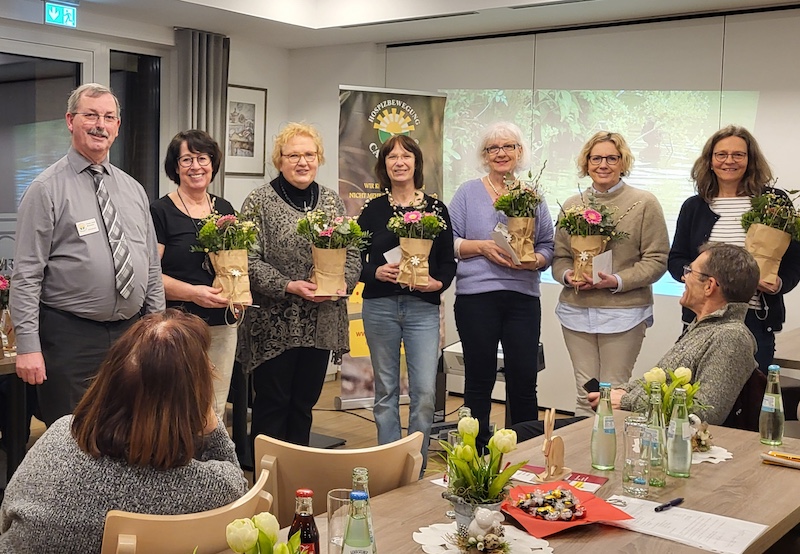 Vorsitzender Franz-Josef Breukers ehrt für 10 Jahre: Ingrid Weber, für 5 Jahre: Karina Finken, Rosel Cleef-Stassen, Roswitha von der Heide, Irmgard Treuling – 10 Jahre, Kirsten von Fürstenberg – 25 Jahre
