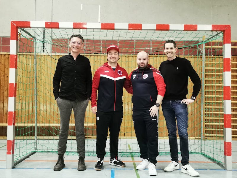 Die Spiele des 1. Bougie-Hallencups wurden vom Namensgeber und Unterstützer (v. l. n. r.) René Bougie, Jugendleiter Janek Simons sowie dem 1 Vereinsvorsitzenden der SVG BLS, Christoph Philippen und dem Bürgermeister der Gemeinde Gangelt, Guido Willems begleitet.