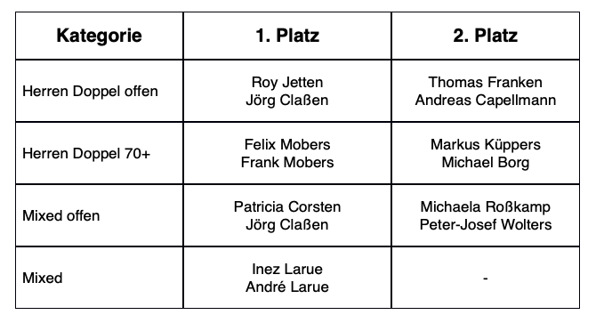 Ergebnisse 38. internationale Mixed | Doppel-Turnier beim TC Selfkant-Westerheide