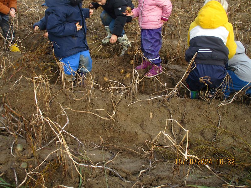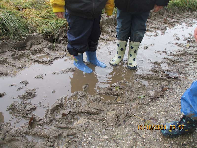 Ausgestattet mit Matschhosen und Gummistiefel spazierten wir auf’s Feld. Die Herausforderung durch Matschwege und sumpfige Felder führte uns zum Kartoffelfeld.