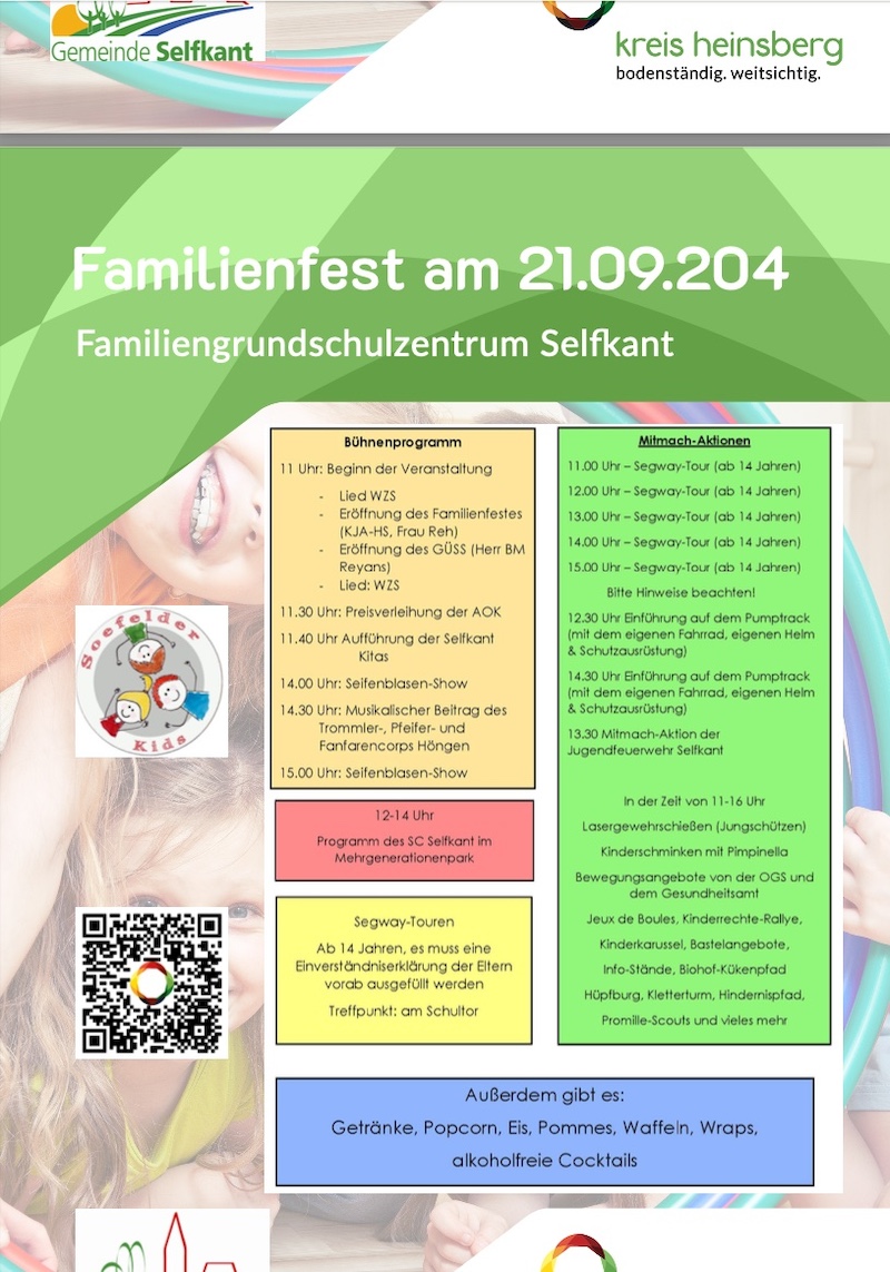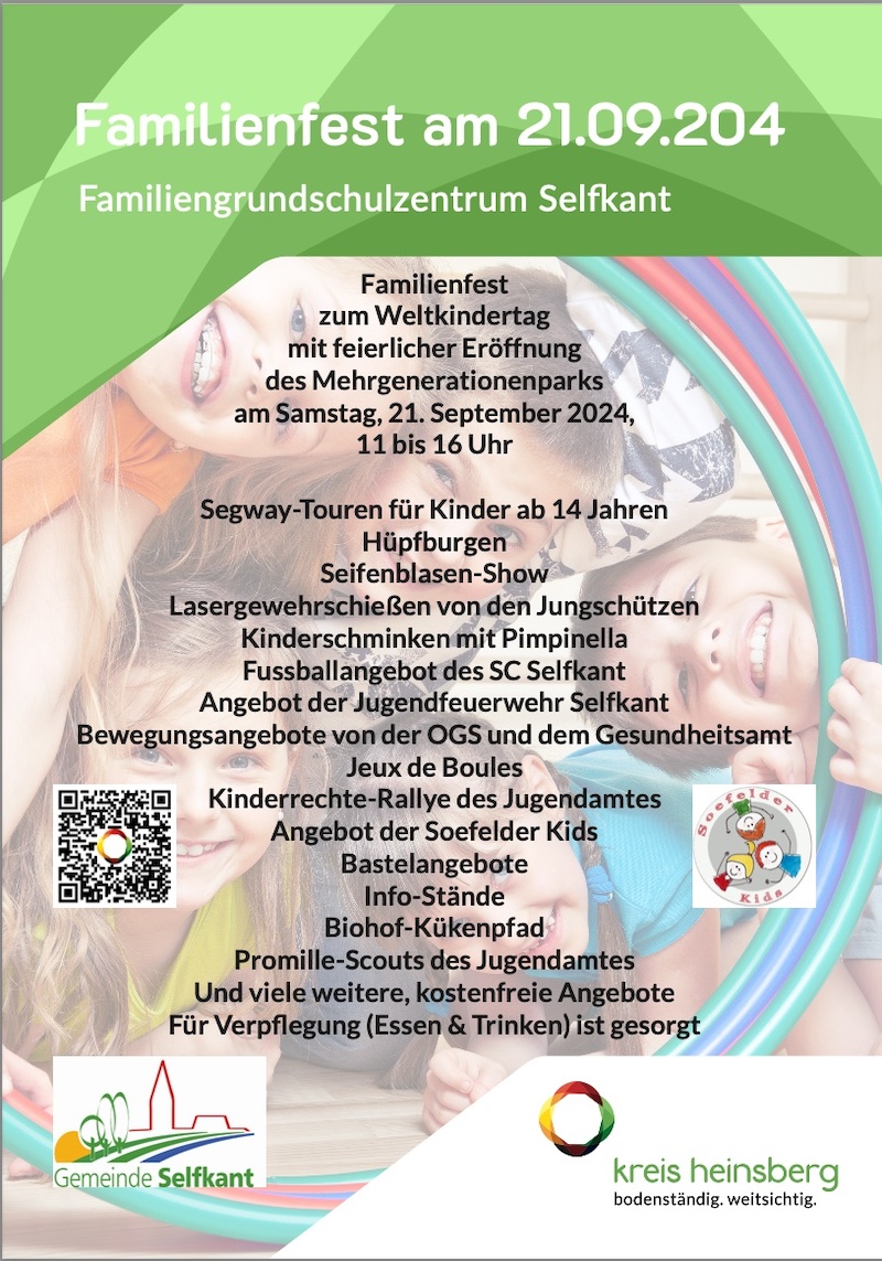 Das Kreisjugendamt Heinsberg lädt am Samstag, den 21. September 2024, gemeinsam mit der Gemeinde Selfkant und der Westzipfelschule zu einem großen Familienfest ein. Von 11 bis 16 Uhr erwartet die Besucher ein abwechslungsreiches Programm auf dem Gelände des Familiengrundschulzentrums der Westzipfelschule am Standort Saeffelen.