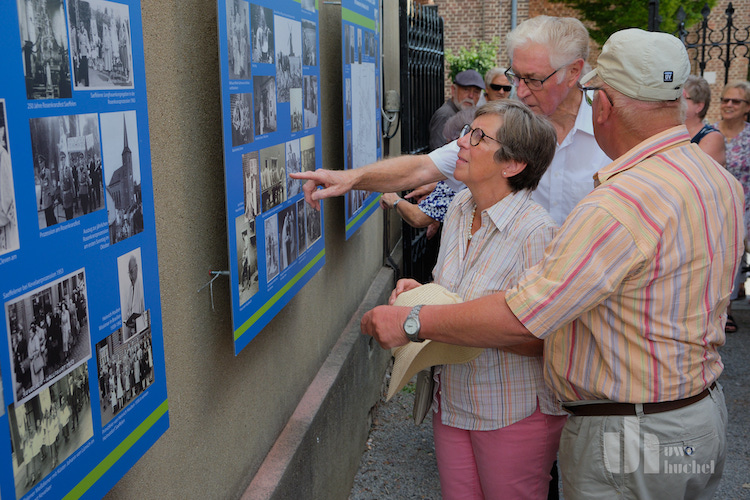 Nun gab es kein Halten mehr. Im Nu bildeten sich vor den zehn Bildtafeln viele kleinere und immer wieder wechselnde Gruppen von Gästen, für welche die insgesamt 144 präsentierten Bilder Implusgeber waren, um gemeinsam in Erinnerungen zu schwelgen und zu spekulieren, wo und wann ein Bild aufgenommen worden war um wem es zeigt. So entstanden viele spontane Gespräche und die Zeit verging wie im Fluge.