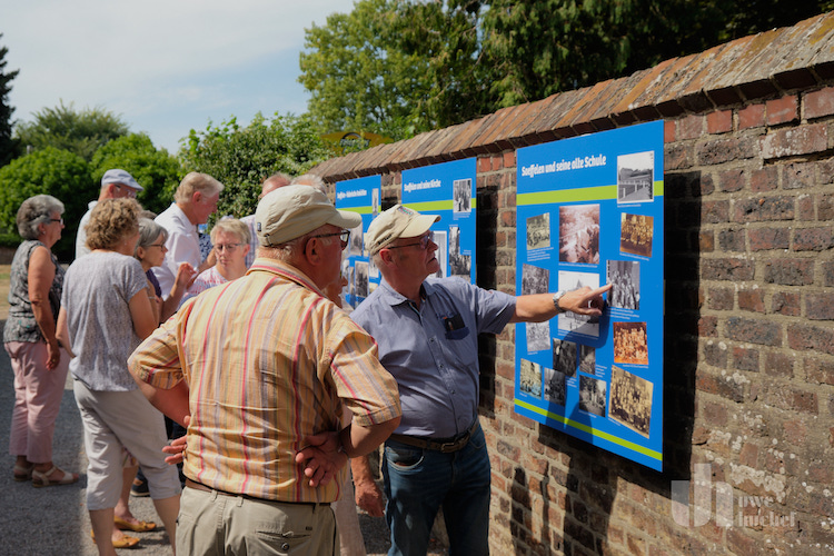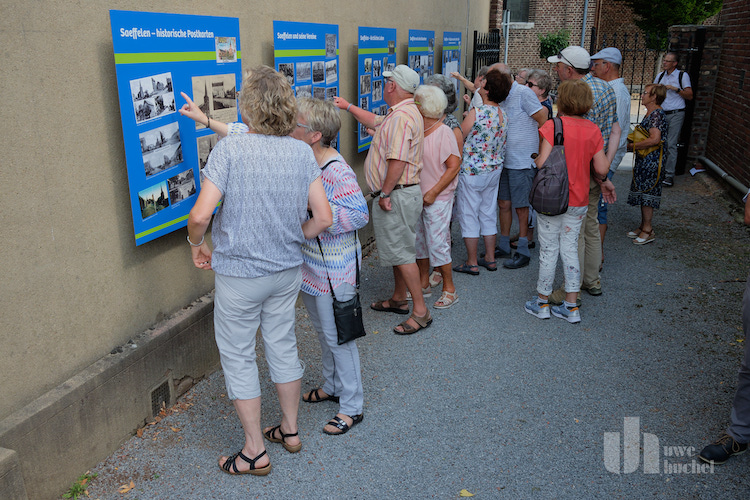 Um 14.30 Uhr fand dann anlässlich der Galerieeröffnung erstmalig die Ortsführung Saeffelen Teil 2 statt: Saeffelen, ein maasländisches Anger-, Grenz- und Schmugglerdorf erzählt seine bewegte und wechselhafte Geschichte im Wandel der Jahrhunderte. Aufgrund der außergewöhnlichen Hitze wurde sie kurzerhand einfach in die Kirche verlegt, dem wahrscheinlich kühlsten Ort in ganz Saeffelen. Dort zog Brigitte Geradts-Wimmers ihre Zuhörerinnen und Zuhörer von Beginn an in den Bann. Kurzweilig, informativ, anschaulich und gespickt mit Anekdoten führte sie ihre Gäste fiktiv durch den Ort und enthüllte, wie das Leben der Saeffelenerinnen und Saeffelener in früheren Zeiten ausgesehen und welch eine Rolle der Buchweizenpfannkuchen dabei gespielt hat. Die Gäste lauschten der Geschichte von der gestohlenen und wiedergefundenen Leiche, vom Versteck im Misthaufen und vom davongelaufenen Pferd.