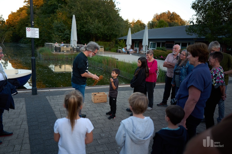 Mit Einbruch der Dunkelheit ging es auf Tour. Klarer Himmel und angenehme Temperaturen waren ideale Voraussetzungen zur Beobachtung. Faszinierend war es zu sehen, wie die Wasserfledermäuse über dem Kahnweiher im Licht der Taschenlampe jagen. Ein unvergessenes Erlebnis für Groß und Klein.