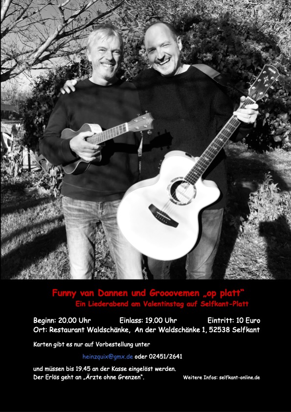 Und nun schließt sich der Kreis. Denn nach den sicherlich mehr als 300 „hochdeutschen“ Liedern, mit denen Funny in den letzten Jahrzehnten auf vielen Bühnen der Republik unterwegs war und die seine Fangemeinde fast im Schlaf mitsingen kann, gibt es Funny jetzt wieder „op platt“ – und das natürlich in seiner Heimat. Aber er wird nicht alleine auf der Bühne stehen, sondern gemeinsam mit den Grooovemen – und zwar am 14. Februar 2025 in der „Waldschänke“ in Süsterseel (liegt im Übrigen in unmittelbarer Nähe der einst wehmütig besungenen „Birkebüschkes“ und „Düvelspädjes“, s. o.).Die „Grooovemen“, das sind der ehemalige Süsterseeler Heinz Quix (Zweibrüggen), diesmal gemeinsam mit Funny am Mikrofon, aber auch an der Gitarre/Ukulele, und der Geilenkirchener Jakob Schönleber als Rhythmusgeber auf der Cajon, der bei diesem Auftritt aber nur bei einigen Liedern mitspielen und für die Technik verantwortlich sein wird. Als eingespieltes Duo sind die „Grooovemen“ schon seit vielen Jahren sehr erfolgreich mit Funnys Liedern im Selfkant und im Heinsberger Land unterwegs – und nun also als Trio. Sicherlich werden uns die drei Musiker mit vielen neuen Liedern „op platt“ auf eine sehr fantasievolle Reise mitnehmen.
