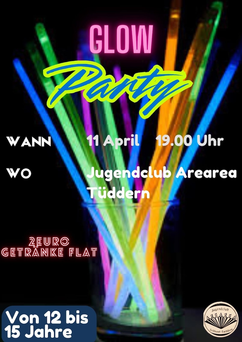 Am Freitag, 11.04.25 lädt der Jugendclub Arearea und der Jugendtreff Alte Schule Höngen alle Jugendlichen von 12 - 15 Jahren zu einer Glow Party in den Jugendtreff an der Turnhalle in Tüddern ein. (Zur Turnhalle 4)