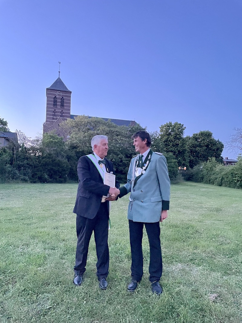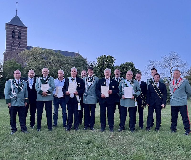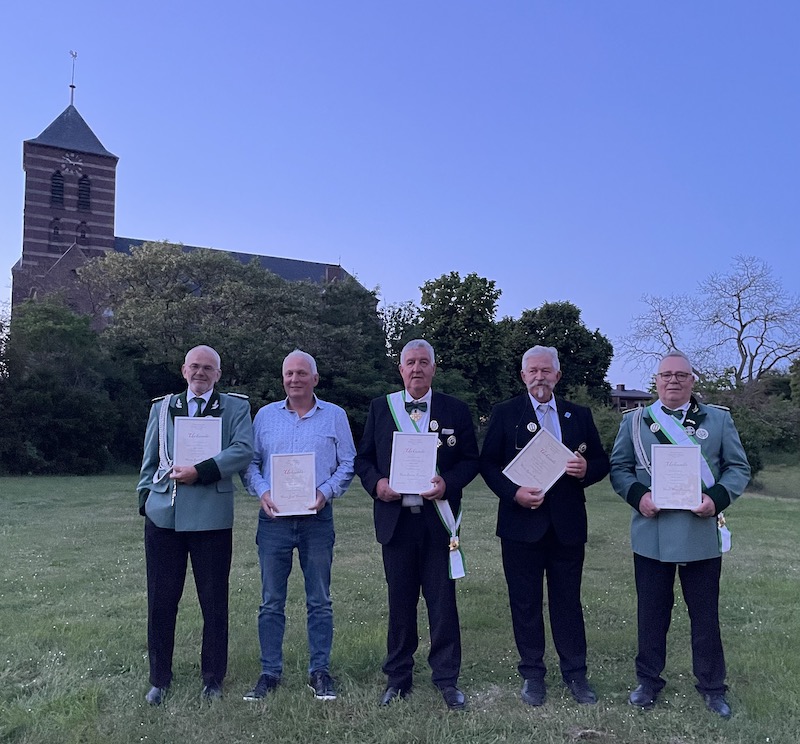 Doch bekanntlich bedeutet Schützenfest auch immer Umbruch innerhalb der Schützenbruderschaft. Gleich fünf langjährige Vorstandsmitglieder entschieden sich dazu, nach dem Fest aus dem Vorstand auszuscheiden, um Platz für jüngere zu machen. Allen voran Präsident Lorenz Küsters, seit 1982 Mitglied des Vorstandes, von 1990 bis 2015 sowie wieder ab 2019 Präsident der Haverter Schützen. Doch an die Schützenrente ist bei ihm noch nicht zu denken, Lorenz Küsters bleibt dem Verein als Ehrenpräsident und Hausmeister des Schützenheimes erhalten. Auf sage und schreibe 45 Jahre aktive Vorstandsarbeit könne Hans Donners und Reiner Tulodetzki zurückschauen. Beide sind seit 1978 im Vorstand und scheiden nun aus, nachdem sie auf dem Schützenfest bereits die höchste Auszeichnung des Bund der Historischen Deutschen Schützenbruderschaften erhalten haben. Ebenfalls aus dem Vorstand scheiden aus Josef Hensgens (seit 1999 im Vorstand) und Roel de Jong (seit 2012 im Vorstand).
