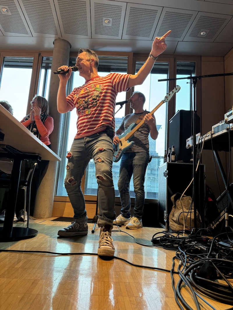 Ein besonderes Highlight war dann natürlich der Besuch des Deutschen Bundestages. In ihren Ornaten zogen die rund 50 Karnevalisten gemeinsam mit Wilfried Oellers durch die Räumlichkeiten des Parlaments. Vor dem Besuch der Besuchertribüne des Reichstags spielten die Kellerjunges - mit Blick auf die Kuppel des Deutschen Bundestages und brachten Berlin zum Schunkeln. Vor dem Auftritt sorgte "Emmele" (Björn Küsters) von den Boggeder Jröne (Bocket) mit lockeren Sprüchen für Stimmung.