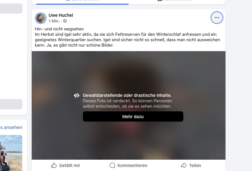 Im Herbst sind Igel sehr aktiv, da sie sich Fettreserven für den Winterschlaf anfressen und ein geeignetes Winterquartier suchen. Igel sind sicher nicht so schnell, dass man nicht ausweichen kann. Ja, es gibt nicht nur schöne Bilder, wie im Titelbid gezeigt.Facebook hat so reagiert. Auch eineMöglichkeit die Realität auszublenden