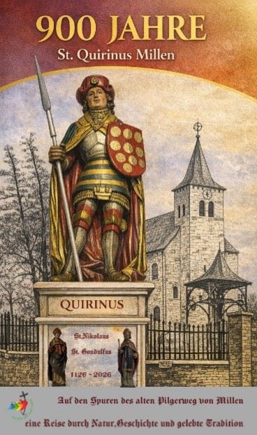 Vor Tagen sah die Historie ein neues Kapitel ausgeschlagen. Zwei Pilger aus Neuss hatten Ortsvorsteher Erich Hacken informiert, dass sie auf ihrer Etappenreise des Jakobs Pilgerweg die Ortschaft Millen erreichen. Maastricht war am Tage danach das Ziel auf dem ersten Etappenabschnitt bis Lüttich mit späteren Endziel Ankunft in der ewigen Stadt Rom. Christian Ihben und Jürgen Gepkems aus Neuss erreichten Millen am Nachmittag, hatten damit den einstigen Quirinus-Pilgerweg zu neuem Leben erweckt. Ihben ist sehr aktiv in der Quirinus-Verehrung und Geschichte wie auch Erich Hacken aus Millen. Hacken rief vor Monaten bereits das Quirinus-Jahr mit der 900-Jahrfeier (1126-2026) der Verehrung in Millen aus, in der zweiten Jahreshälfte treffen sich die Quirinus-Freunde aus mit Neuss, Perl an der Mosel, Püchersreuth und St. Quirin (Fugesen, Frankreich) die fünf hauptamtlichen Orte, die die Quirinus-Verehrung leben und allesamt begeben sich auf historischen Spuren.