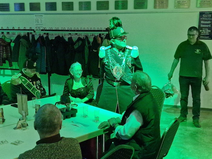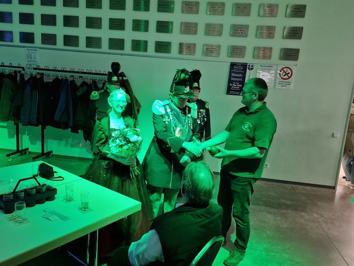 Tüddern. Leo und Irma Niessen, das Europakönigspaar der Europäischen Schützengemeinschaft aus dem benachbarten Linne (NL), besuchten als Ehrengäste mit ihren Adjutanten Jack van Duinen und Fred van Hal die St. Sebastianus-Schützenbruderschaft Tüddern e.V. Aufgrund des übervollen Terminkalenders der europäischen Schützenmajestäten war die Teilnahme an der diesjährigen Maikirmes vom 26. – 22. Mai 2022 im Festzelt auf dem Dorfplatz leider nicht möglich, so entschlossen die beiden sympathischen Vereinsmenschen kurzerhand die Tüdderner Bruderschaft beim jährlichen Ostereierschießen in der Westzipfelhalle zu besuchen. Die anderen Besucher des Ostereierschießens staunten nicht schlecht, ob des hohen Schützenbesuches. Die beiden fielen natürlich in Ihrer schicken Uniform und die Königin im festlichen Kleid unter den anderen Gästen auf. Der Präsident der Tüdderner Schützenbruderschaft – Franz-Josef von Ameln begrüßte die Ehrengäste sehr herzlich und überreichte dem Europakönig eine Flasche Jubiläumstropfen und seiner Gattin Irma einen Blumenstrauß. Im Gegenzug heftete Leo Niessen den Verantwortlichen der Tüdderner Bruderschaft den Orden des Europakönigspaares an. Den anwesenden Jungschützen überreichte er eine Erinnerungsnadel für die Uniform.