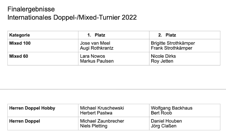 Zum 36. Mal in Folge wurde bei idealen Wetterbedingungen auf der Anlage des TC Selfkant Westerheide in der Woche vom 29.08.- 04.09. 2022 das beliebte Mixed-Doppelturnier ausgetragen. Nach einigen Jahren Pause wurden nun endlich wieder spannende Spiele auf der Anlage ausgetragen! Gespielt wurde in vier Kategorien, darunter in einer Hobby- Kategorie mit 44 TeilnehmerInnen, darunter mit vielen SpielerInnen aus umliegenden Vereinen der Niederlande.