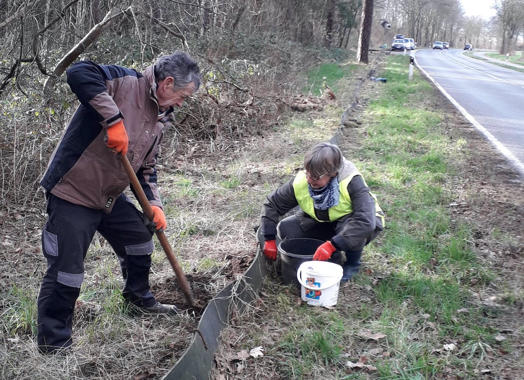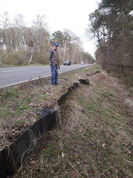 Wie in jedem Jahr musste der Krötenzaun an der K1 zwischen Tüddern und Süsterseel wieder instandgesetzt werden. Mit dem Freischneider wurde der Zaun von abgestorbenen Brennesseln und Gräsern befreit, an vielen Stellen musste er ausgebessert und durch Eisenstäbe stabilisiert werden und natürlich wurden alle 25 Meter Eimer eingegraben, in denen die Kröten, Grasfrösche und auch Molche hineinfallen sollen, bevor sie durch Autofahrer überrollt werden. Täglich werden die Eimer kontrolliert und die Tiere liebevoll auf die andere Straßenseite gesetzt. Hier können sie dann ihre jährliche Wanderung zu ihren Laichgewässern fortführen. Würde diese Arbeit nicht von ehrenamtlichen Aktiven absolviert werden, so würden immens viele Kröten, Grasfrösche und Molche den sicheren Tod durch den Straßenverkehr finden. Birgit Wynands, deren Tochter Carla, Hermann-Josef Schmitz, Peter Hamacher sowie meine Wenigkeit haben am Montag, den 14.2.2022 in 2 Stunden diese Arbeiten fertiggestellt.