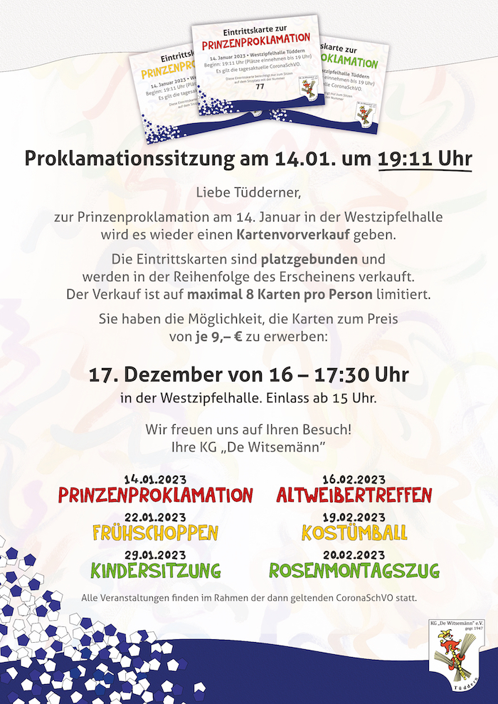 Am Samstag, den 14.01.2023 findet ab 19.11 Uhr die Proklamationssitzung der KG De Witsemänn statt. Der Kartenvorverkauf zu dieser Veranstaltung findet am Samstag, den 17.12.22 von 16.00.-17.30 Uhr in der Westzipfelhalle statt. Einlass ist ab 15.00 Uhr. Die Karten werden in der Reihenfolge des Erscheinens verkauft, maximal 8 Karten pro Person. Der Eintrittspreis beträgt 9 €.