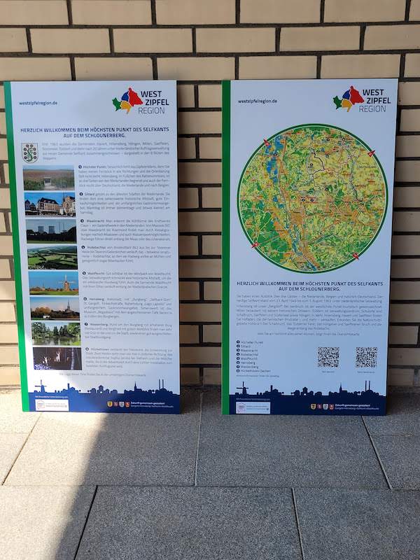 Auf Alu Di-Bondschildern wird eine Orientierungskarte abgebildet, die der die jeweiligen Landmarken eingezeichnet werden. Der Grafiker Kurt Stieding empfahl dazu eine Abbildung, bei der der Standort im Mittelpunkt ist. Zusätzlich findet man da eine kurze Information zum Selfkant, die man über QR-Code auch auf Deutsch oder Niederländisch anhören kann.