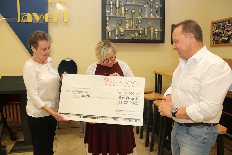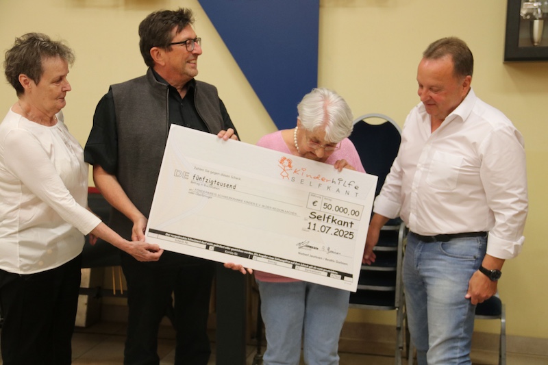 In diesem Jahr gab es erneut einen Scheck über 50.000€, erneut fehlten Frau Göschel die Worte. Im Vorjahr war der Förderverein schwerkranke Kinder in der Städteregion Aachen sprachlos, erhielt mit ebenfalls 50.000€ die größte Spende seine Geschichte. Auch in diesem Jahr kullerten leichte Freudentränchen, abermals wurden 50.000€ als Spende überreicht. „Für uns ist es ein besonderes Zeichen mit der Kinderhilfe Selfkant eine Gemeinschaft gefunden zu haben, die wir ein gemeinsames Anliegen hat den betroffenen Familien in Not, leider häufig mit verkürzten lebensverkürzenden Erkrankungen der Kindern in ihrer Lebenssituationen Hilfen zu ermöglichen, die von der Solidargemeinschaft der Krankenkasse nicht geleistet werden“ sprach Friedhelm Siepmann vom Förderverein auch im Namen von Frau Göschel.