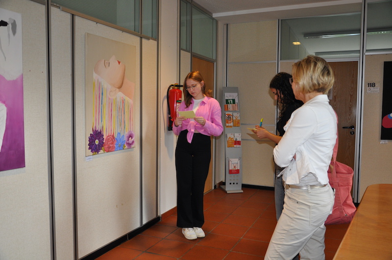 Nach den offiziellen Reden hatten die Besucher die Gelegenheit, direkt mit den jungen Künstlerinnen ins Gespräch zu kommen. Diese standen an ihren Kunstwerken, präsentierten ihre Werke und beantworteten Fragen der Anwesenden.