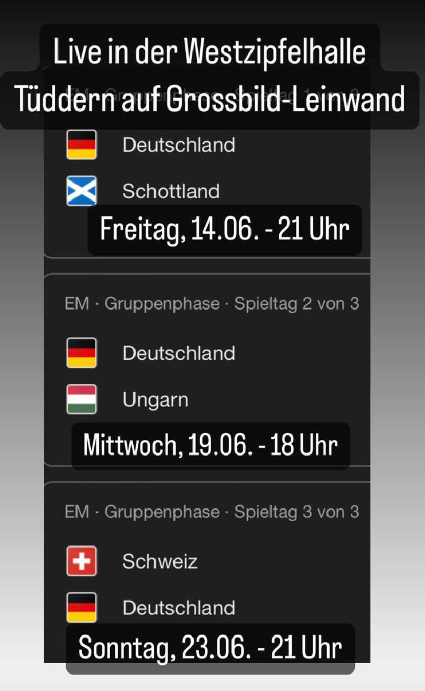 Alle Vorrundenspiele mit deutscher Beteiligung und alle Deutschlandspiele ab dem Viertelfinale werden live auf Großbildleinwand in der Westzipfelhalle gezeigt. Für gekühlte Getränke, Hot-Dogs und Snacks ist gesorgt. Der Eintritt ist frei und der Einlass erfolgt jeweils 45 Minuten vor Anpfiff!