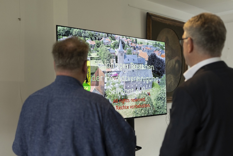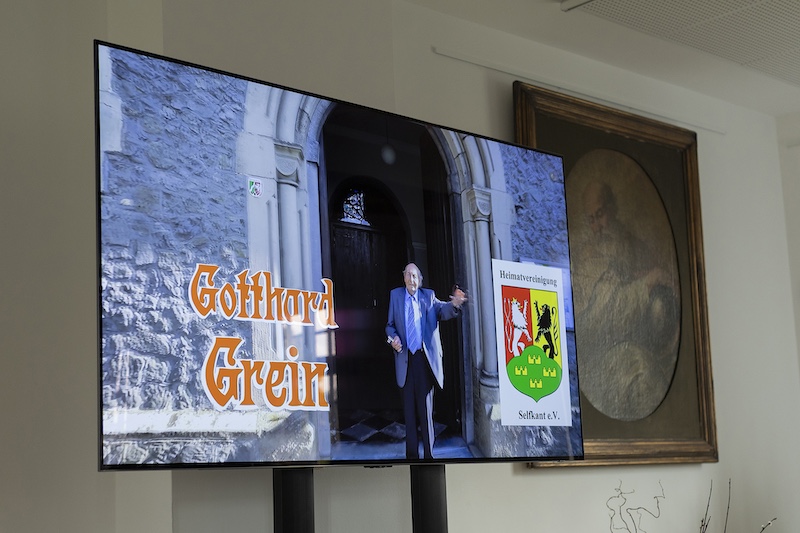 Denn es stand die Uraufführung des Films „Kirchenführung in der Millener Kirche mit Gotthard Grein“ auf dem Programm, der von Leon Pisters unter Mitwirkung des Vorstandes und Organist Nicolai Dreissen mit viel Zeit- und Arbeitsaufwand Ende 2024 fertiggestellt wurde. Paul Beckers würdigte in seiner Begrüßungsansprache nochmals das Wirken den im Jahr 2024 verstorbenen Gotthard Grein für die Heimatvereinigung Selfkant mit seinen immer wieder fesselnden und inspirierenden Kirchenführungen in der Kirche von Millen. Er betonte weiterhin, dass Gotthard Grein‘s unzählig initiierte Führungen über das kirchliche Leben in Millen weit über die Grenzen hinaus bereichert haben. Damit wird nicht nur sein Lebenswerk gewürdigt, sondern auch seine Werte, die er vermittelt hat, weitergetragen.