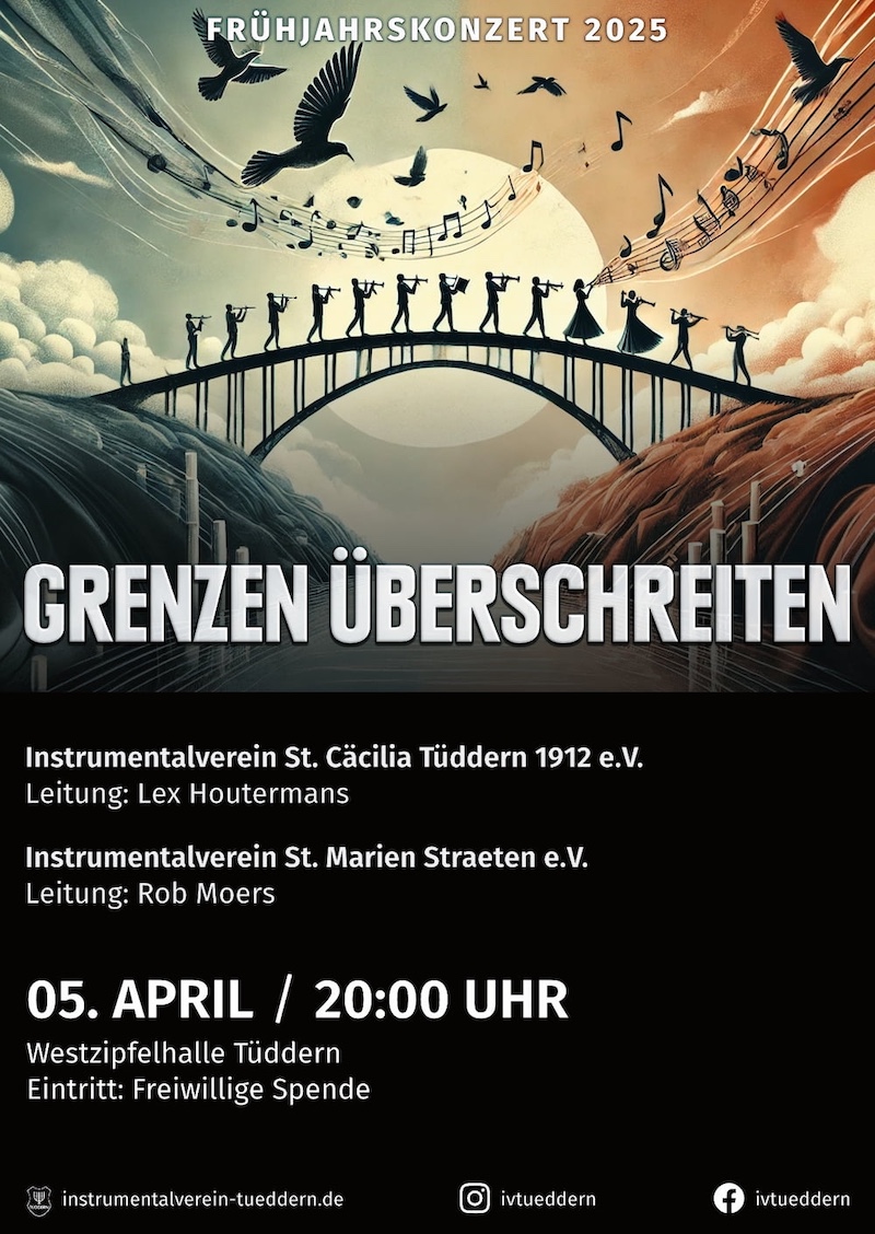 Unter dem Motto „Grenzen überschreiten“ gibt der Instrumentalverein Tüddern am 05. April um 20 Uhr sein diesjähriges Frühjahrskonzert. Die zu überschreitenden Grenzen sind dabei vielfältig, und so nehmen die Musiker das Publikum unter anderem mit in den wilden Westen, auf die raue See oder in die Welt der Videospiele.