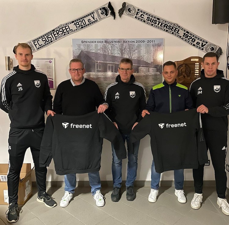 Auf dem Bild (von links nach rechts): Jan-Niklas Schubert (Spielführer 2. Mannschaft), Frank Scheuvens (Gebietsleiter freenet),