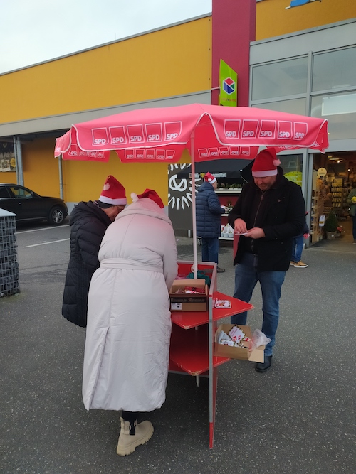 So standen wir vom Ortsverband Selfkant ab 11 Uhr auf dem Parkplatz des Nahversorgungszentrums in Süsterseel und haben kleine Präsente zum Nikolaus an die Einkaufenden dort verschenkt.
