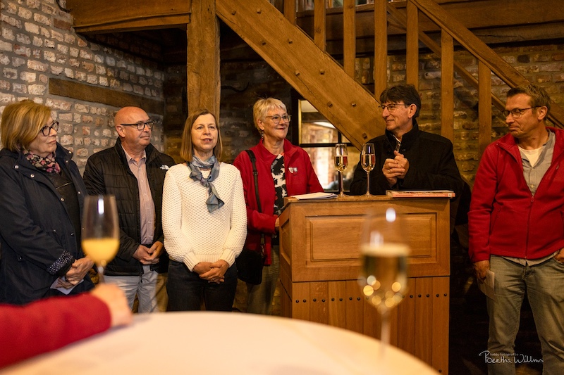 Gemeinsam fand man sich zum offiziellen Empfang des Bürgermeisters in der Zehntscheune ein, gut gestärkt begaben sich die Jugendlichen dann in die Familien und die Erwachsenen führten das Vormittagsprogramm der Jugendlichen durch: ein Besuch in Huis Millen, der Burg der Herren von Millen, in der heute Sabine Lintzen eine Glaswerkstatt hat. Frau Lintzen ist eine weltweit anerkannte Künstlerin, die mit den französischen Gästen Glaskugeln herstellte, die diese als Erinnerungsgeschenk des Partnerschaftsvereins mit nach Hause nehmen durften.