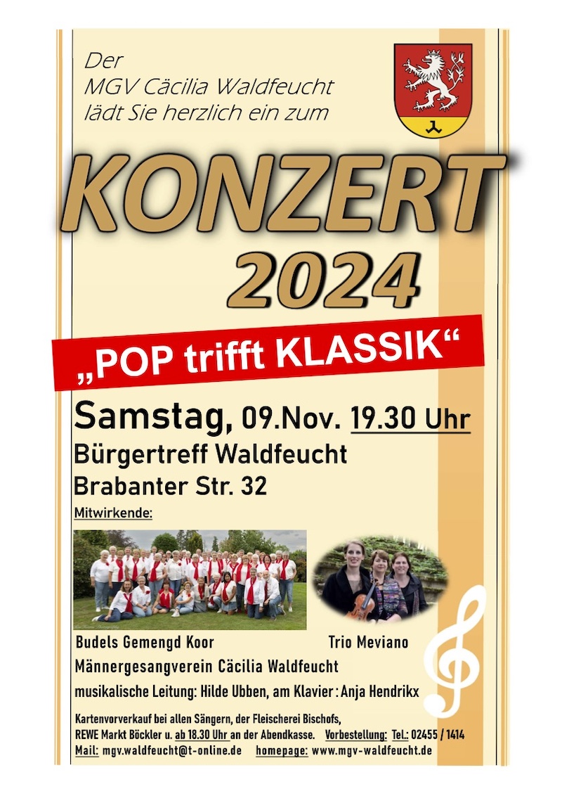 Herbstkonzert des MGV Cäcilia Waldfeucht am 09. Nov. 2024 um 19.30 Uhr Waldfeucht Zu seinem Herbstkonzert am Samstag, 09. Nov. 2024 hat der MGV Cäcilia Waldfeucht in diesem Jahr besondere musikalische Gäste in den Bürgertreff Waldfeucht, Brabanter Str. 32 eingeladen. Das Konzert beginnt um 19.30 Uhr. Einlass ist ab 18.30 Uhr.